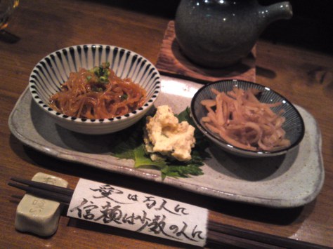 Another Izakaya classic! Three types of tubers: Thick Sweet Potato Chips, boiled and lightly fried potatoes and again boiled and lightly fried satoimo/里芋/taro!