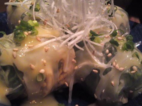 The tone was immediately set with the first drink, a nectar from Morimoto Brewery in Kikugawa City, served in original pottery with a simple but succulent o-hitashi/lightly cooked and marinated appetizer made with vegetables including chrysanthemum petals!