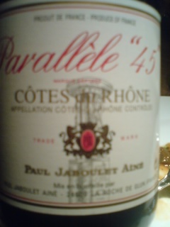 I don’t have to explain that the wine had disappeared by then! We contued with a Cote du Rhone, 2006, Parallele 45 distributed by Paul Jaboulet. Just what we needed for the meat!