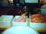 The second dish consists of a plate of sushi (the uni gunkan is not featured as I was no patient enough to wait for it for the pic!) and Japanese soup and pickles!