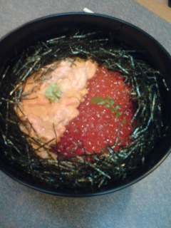 “Uni to Ikura Don”/sea urchin and salmon roe spread over a bowl of rice.