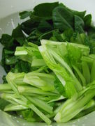 -Cut the komatsuna/spinach into 2 or 3 easy to eat lengths. Chop the ginger fine. Slice the garlic.