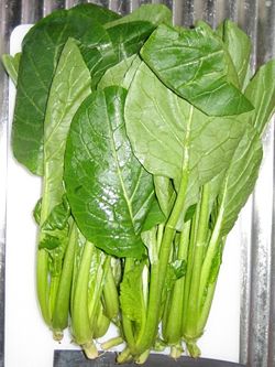 Komatsuna (Brassica rapa var. perviridis or var. komatsuna, コマツナ/小松菜、冬菜、鶯菜) is a type of leaf vegetable. It is a variant of the same species as the common turnip. It is grown in Japan, Taiwan and Korea. It is also known as Japanese Mustard Spinach and can be stir-fried, pickled, boiled and added to soups or used fresh in salads. It is an excellent source of calcium. It is also used for fodder in some Asian countries. The leaves of komatsuna can be eaten at any stage of growth. In a mature plant they are dark green with slender light green stalks, around 30 cm long and 18 cm wide. It is most often grown in the spring and autumn, as it cannot endure extreme heat or cold for more than a short time.