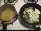 -While you boil the ramen, cut the onion and bacon into thin slices and fry. Boil some very lightly salted water for the soup (if you have bought the ramen with their soup, add it to the water, although it might become a bit heavy)