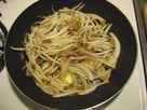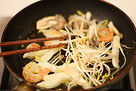 -As soon as the garlic aroma comes out add shrimps and squid and fry until shrimp have changed colour. Add mushrooms, beansprouts, oyster sauce, salt and pepper and stir-fry for a short moment.