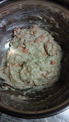 -Add the beaten egg, dashi, flour and (optional) seasoning and mix well.