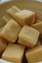 -Soften koyadofu in lukewarm water. Press out all water. Cut into 1.5 cm (0.7 inch) squares and coat with flour. Deep-fry in oil at 160 degrees Celsius. Scoop out as soon as they change color. Tansfer into a sieve basket and pour hot water on it to take out excess oil.