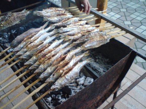We had arrived at Senzu Station 12:04 and still had sometime before taking the bus to Sumatakyo at 13:30. We were getting a bit hungry. Luckily we noticed a gentleman grilling/bbq-ing large yamame!