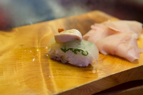 Chef Birukawa had kept a few pieces apart to make this beautiful filefish nigiri with its liver on top!